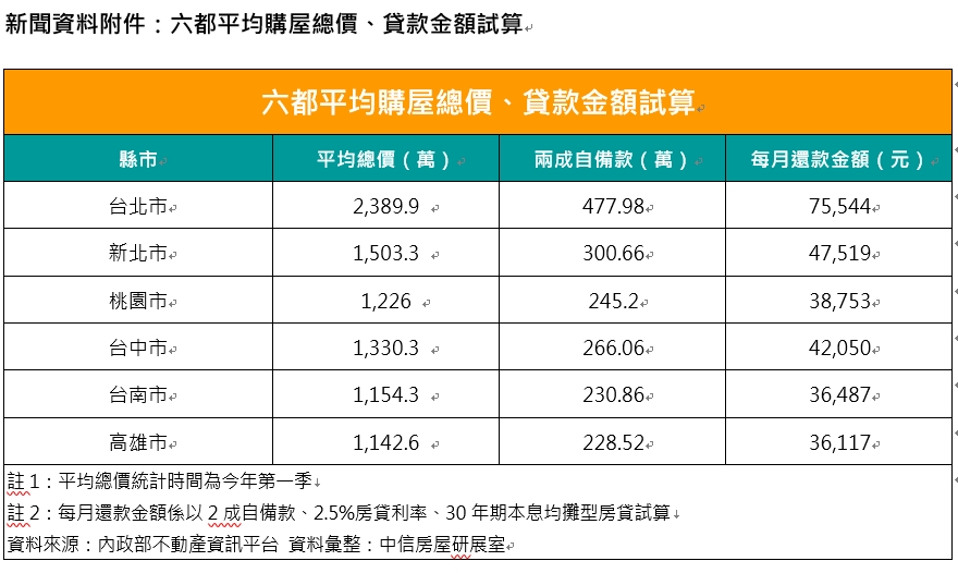 據內政部不動產資訊平台統計,截止到今年第一季,六都的平均購屋總價分別為台北市2,389.9萬元、新北市1,503.3萬元、桃園市1,226萬元、台中市1,330.3萬元、台南市1,154.3萬元、高雄市1,142.6萬元。若以自備款兩成、房貸利率 2.5%、貸款年期30 年、採本息均攤方式試算,僅自備款就需準備約228至478萬元不等;而每月房貸還款金額更高達3.6至7.5萬元。