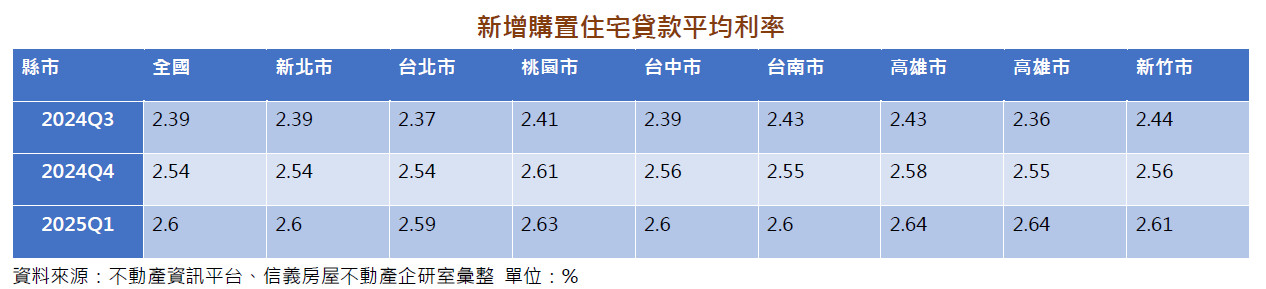 統計顯示,排除優惠房貸的一般房貸統計,連續升息前的房貸利率約為1.52~1.55%,連續升息後到2024第二季為2.36%,後面開始逐漸出現房貸排撥等亂象,再加上銀行自主管理與央行第七波管控,2024年第三季平均房貸利率2.39%,第四季就攀升到2.54%,今年第一季更進一步增加到2.6%,單純比較新增房貸的利率狀況,2.6%水準已經是金融海嘯後的單季新高,反映購屋的市場資金成本明顯增加。