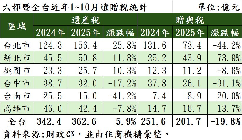 據財政部資料,前10月六都遺產稅表現呈現北熱南冷,其中台北市以156.4億元穩居全台龍頭,年增幅更高達25.8%,為六都之冠;而新北市則以50.8億元位居全台亞軍,年成長11.8%;另外,桃園市遺產稅亦有25.7億元的表現,年增10.3%;反觀中南部三都則呈現衰退,台中市遺產稅截至10月為止,僅實收32億元,較去年同期減少17.2%;台南市則為15.0億元,不僅為六都最末,與去年同期相比亦大減41.2%;高雄市則有42.4億元,年減7.8%;整體而言,六都總計貢獻遺產稅約322.3億元,佔全台總稅收比例將近九成,顯示高資產族群仍高度集中於都會區。