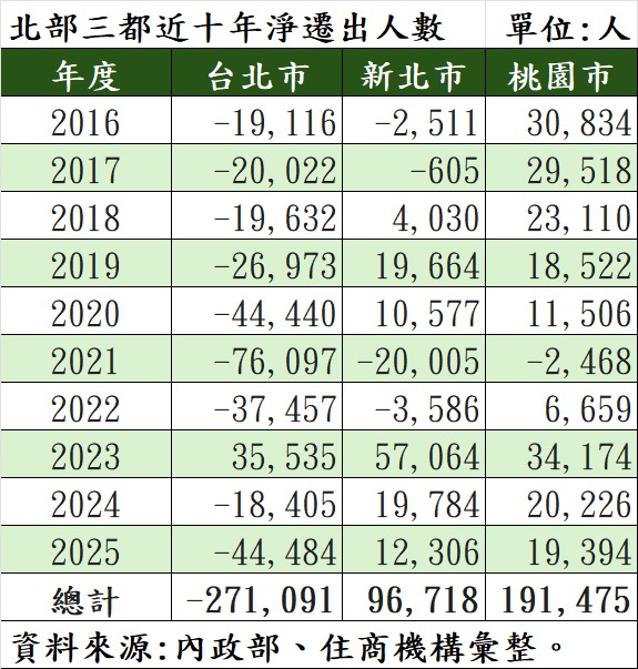 近年來房價高漲,大台北地區人口板塊出現轉移。住商機構根據內政部統計,台北市2016~2025年的十年之間,淨遷出人口高達27.1 萬人,已接近整個大安區人口;反觀鄰近的新北、桃園市,分別淨遷入 9.6 萬、19.1萬人。