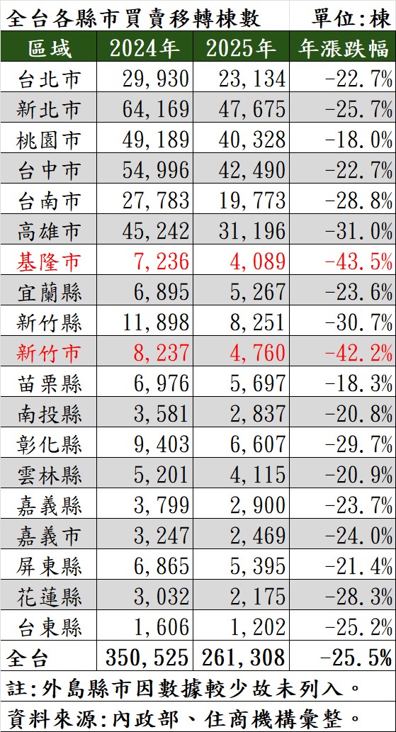 據內政部數據,2025年全國買賣移轉棟數僅26.1萬棟,較2024年的35萬棟相比大幅衰退25.5%,亦創下近9年的新低紀錄,也是自1991年有統計以來,僅次於2016、2001年的歷史第三低紀錄。大家房屋企劃研究室公關襄理賴志昶分析,觀察近年房市買氣歷史變化,最低紀錄出現在2016年,當時因房地合一稅上路,市場充滿不確定性,全年僅24.5萬棟;其次是2001年,當年遭遇網路泡沫化打擊,全年約25.9萬棟;而2025年以26.1萬棟排歷史第三低,主因是2024年房市過熱,引發政府祭出第七波信用管制,加上銀行水位持續緊縮,擊潰買方信心,導致交易量斷崖式下墜。