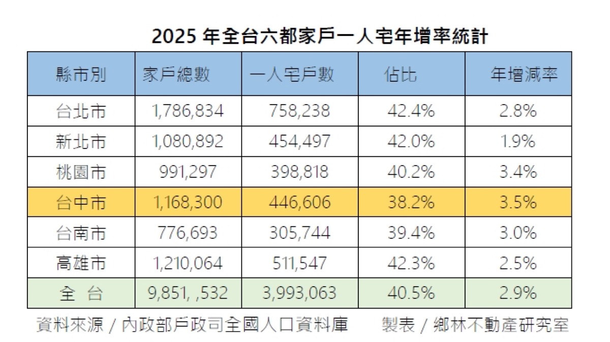 在六大都會區的數據表現中,新北市、台北市及高雄市的一人宅比例均已突破42%,桃園市為40.2%、台南市為39.4%,而台中市則為38.2%。鄉林不動產研究室特別關注到,台中市占比雖看似六都最低,但成長動能最為強勁,戶數從2024年的38.4萬戶增至2025年的44.6萬戶,一年內增加6.2萬戶,年增率高達3.5%,位居六都之冠。這背後反映出晚婚、不婚、高齡化孤老,以及都市化與就業流動加速的社會現狀。