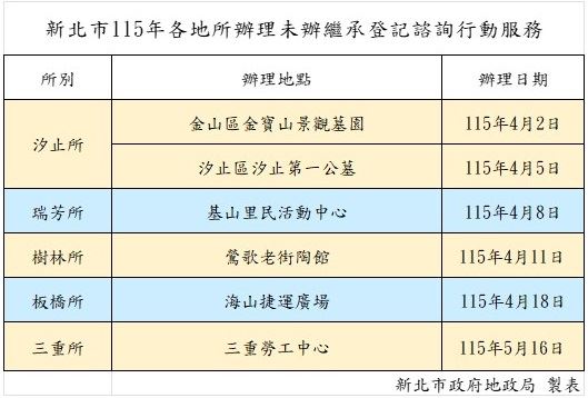 地政局提醒,本次公告將從4月1日起持續至6月30日止,相關資訊會張貼於新北市各地政事務所,以及土地所在地、被繼承人原戶籍地的區公所與里辦公處。民眾若需了解申辦流程或必備文件,除了現場諮詢,亦可多加利用新北市地政局官方網站進行線上查詢,確保家族財產不因疏忽而流失。
