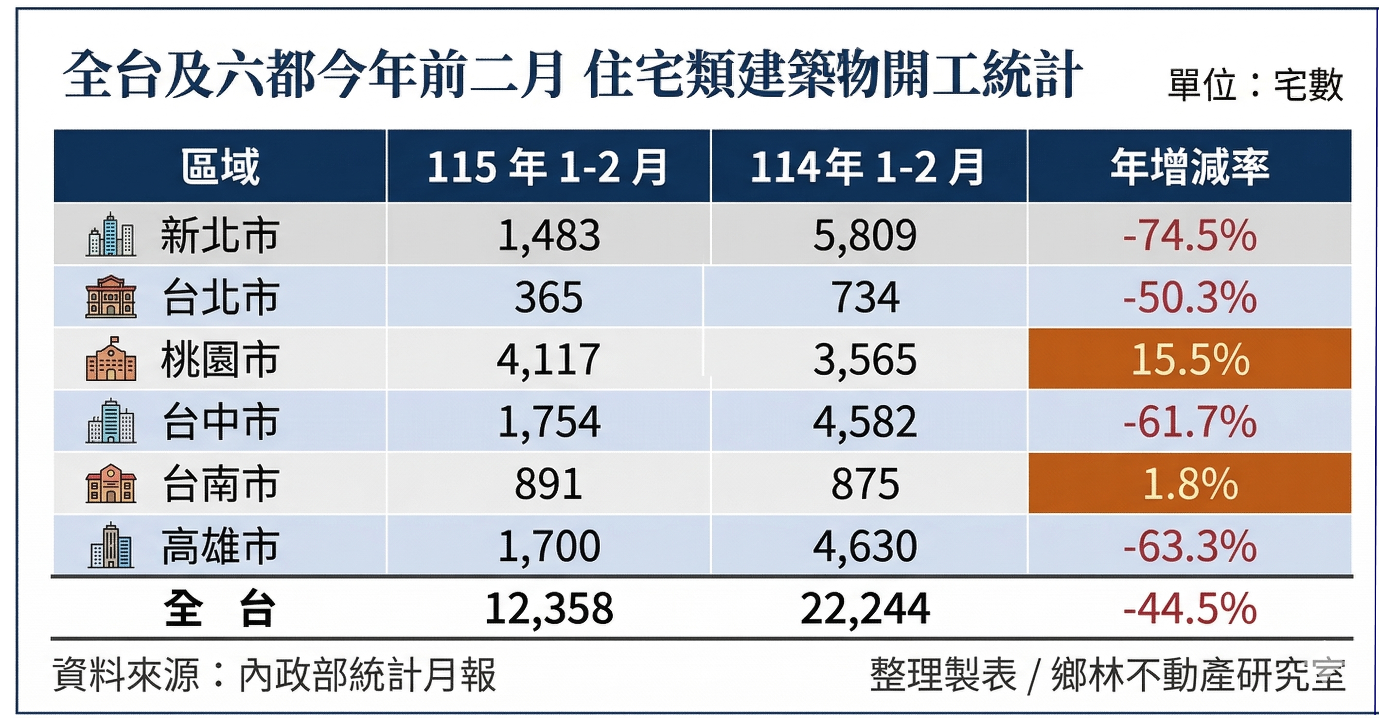 根據內政部最新統計顯示,今年115年1~2月全台住宅類建築物開工戶數僅12,358戶,與去年同期的22,244戶相比,足足減少近一萬戶。六都表現中,僅桃園市與台南市分別以15.5%及1.8%的年增率維持成長,其餘四都減幅均慘跌超過五成。鄉林不動產研究室分析,建商推案意願直直落,已完全反映在開工統計數字的腰斬局面。