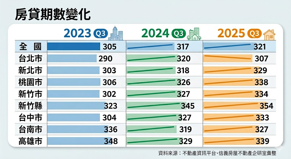 據內政部統計2025年Q3全國平均房貸達321期(26.75年)刷新紀錄。信義房屋分析,受新青安政策與房價高漲影響,30年期房貸已成主流,新世代購屋族多選擇拉長還款期以保留現金投資,與早期長輩急於還款的觀念大不同,顯示房貸結構已隨經濟環境徹底轉型。