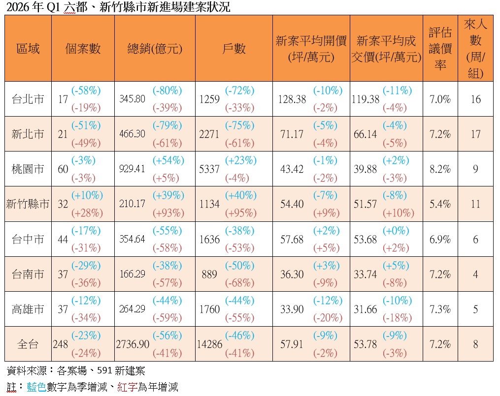 根據591新建案最新統計,全台六都及新竹開季推案動能持續委靡,首季進場建案僅248件,總銷金額約2,736.9億元,各項指標均創下單季歷史新低紀錄。房價漲勢亦顯著熄火,全台平均開價與成交單價分別回落至57.9萬與53.8萬元,較上季修正近1成。包含雙北、桃園及高雄等一線縣市,無論是與上一季或去年同期相比,開價紛紛下挫,馬年開局房市仍籠罩在低迷的氛圍中。