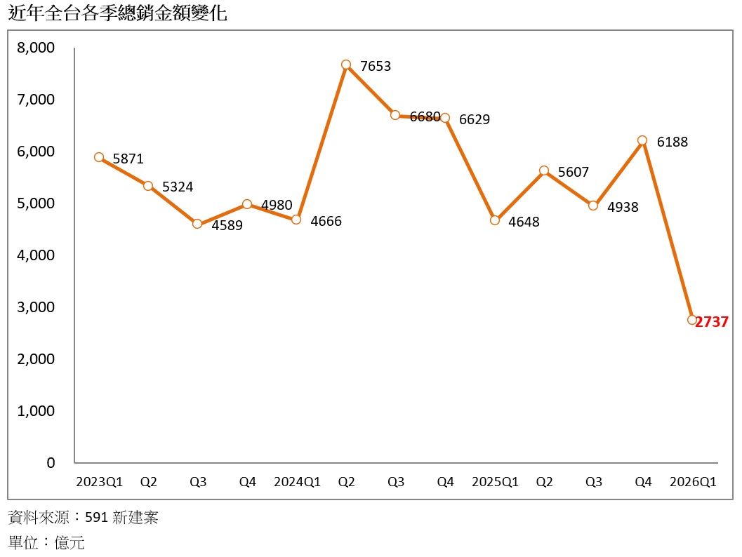 591新建案分析,首季量能重挫主因在於329檔期跳水與農曆春節干擾,加上市場賣壓處於高位,供給面呈現「躺平」狀態。然而,隨延推案陸續公開,建商為避開年底大選亦計畫提早進場,預計520前後將迎來一波報復性推案,不少行政區個案已進入潛銷。屆時建案能否成功吸引買盤回心轉意,將成為建商今年最重要的期中考。