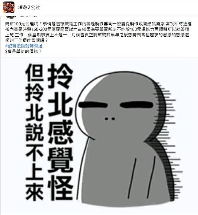 ▼一名網友透露,自己在壽司店兼職工作,但時薪只有100元,因為老闆認為「還要學習所以不能給160元」,質疑這樣的給薪方式「合理嗎?」(圖/翻攝自臉書社團「爆怨2公社」)