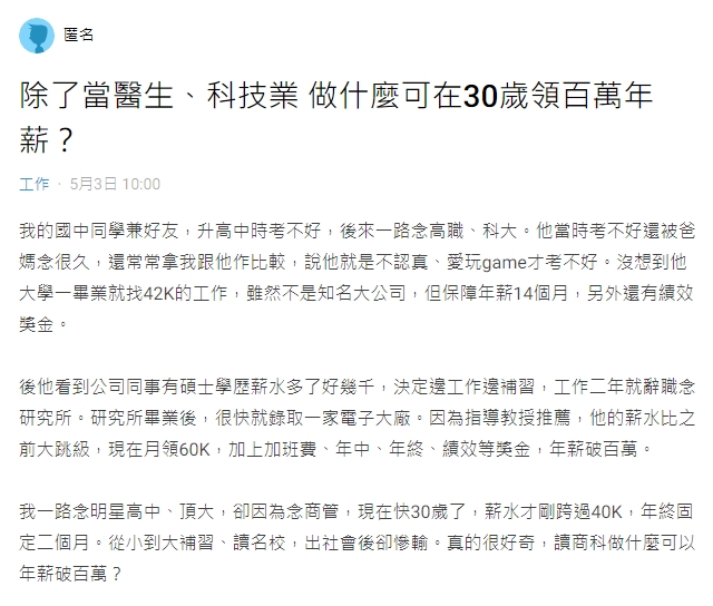 更驚人的是,後來這名國中同學邊工作邊念研究所,如今已錄取一間電子大廠,月薪成功超過6萬元,若加上加班費、年終、年中、績效獎金,年薪已成功突破100萬。而對比原PO,即便一路念明星高中、頂級大學,卻因為選擇商管科系,30歲後薪水才剛超過4萬元,年終也只有固定2個月,讓原PO非常好奇「讀商科要做什麼工作,才能在30歲達成年薪100萬?」。