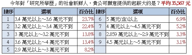 相較之下,對於擁有「研究所學歷」的新鮮人,資方平均願意給的起薪為35,567元,相較於去年的33,989元,提高1,578元,同樣是連5年彈升,增幅為4.6%,也同創12年以來新高;而且若對比「學士」學歷,「研究所」的起薪多了3,011元,等於又高出9.2%!