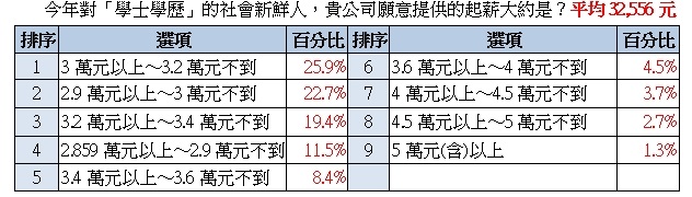 本次調查更發現,今年企業對「學士學歷」的社會新鮮人,平均願意提供的起薪是32,556元,連5年呈現反彈,而且相較去年的31,136元,還多了1,420元,增幅有4.6%,並創下12年以來新高!