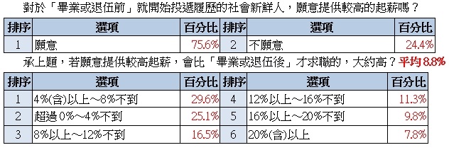 對於「畢業或退伍前」就開始投遞履歷的社會新鮮人,就有高達75.6%的企業指出,「願意」提供較高的起薪;而且比起「畢業或退伍後」才求職的,大約高出8.8%,顯見「求職早鳥族」享有的「待遇溢價空間」仍不小。同樣對於「畢業或退伍前」就開始投遞履歷的社會新鮮人,更有高達88.3%的公司表示,「願意」提供較高的錄取機會。
