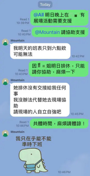 不過這名員工隨後也在留言區還原回來龍去脈。她先表示自己是在休息時間才用手機,「小組長,妳別找我碴,說我上班滑手機。」她接著說,公司雖在面試時提到需要支援展場,但並未告知會「前一天晚上才臨時通知」,自己也已向主管反映,希望可提早安排人力調度事宜,卻未見到改善。她更強調,「我不覺得有必要為了公司不合理的制度,而打擾到我個人的下班時間,但我很有禮貌地還是回妳訊息,不懂妳不去找主管反應,卻PO上網的目的是?」