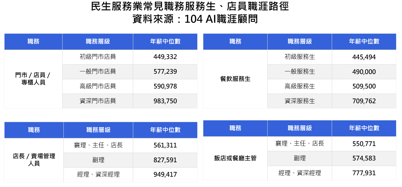 觀察餐飲服務生與門市/店員專櫃人員發現,初級餐飲服務生的年薪中位數落在45萬,資深服務生(年資10年以上)可達約70萬元、薪資成長上看60%;轉任店長以上的管理職,年薪中位數區間在55萬至78萬之間,薪資增幅落在24-75%。初級門市店員平均年薪中位數約45萬,若累積資歷或業績出色晉升為資深門市店員,年薪中位數可達98萬,轉任店長或賣場管理職後,管理津貼加持,襄理至經理級的年薪中位數可從56萬元、一路上升至95萬,薪資翻倍成長。