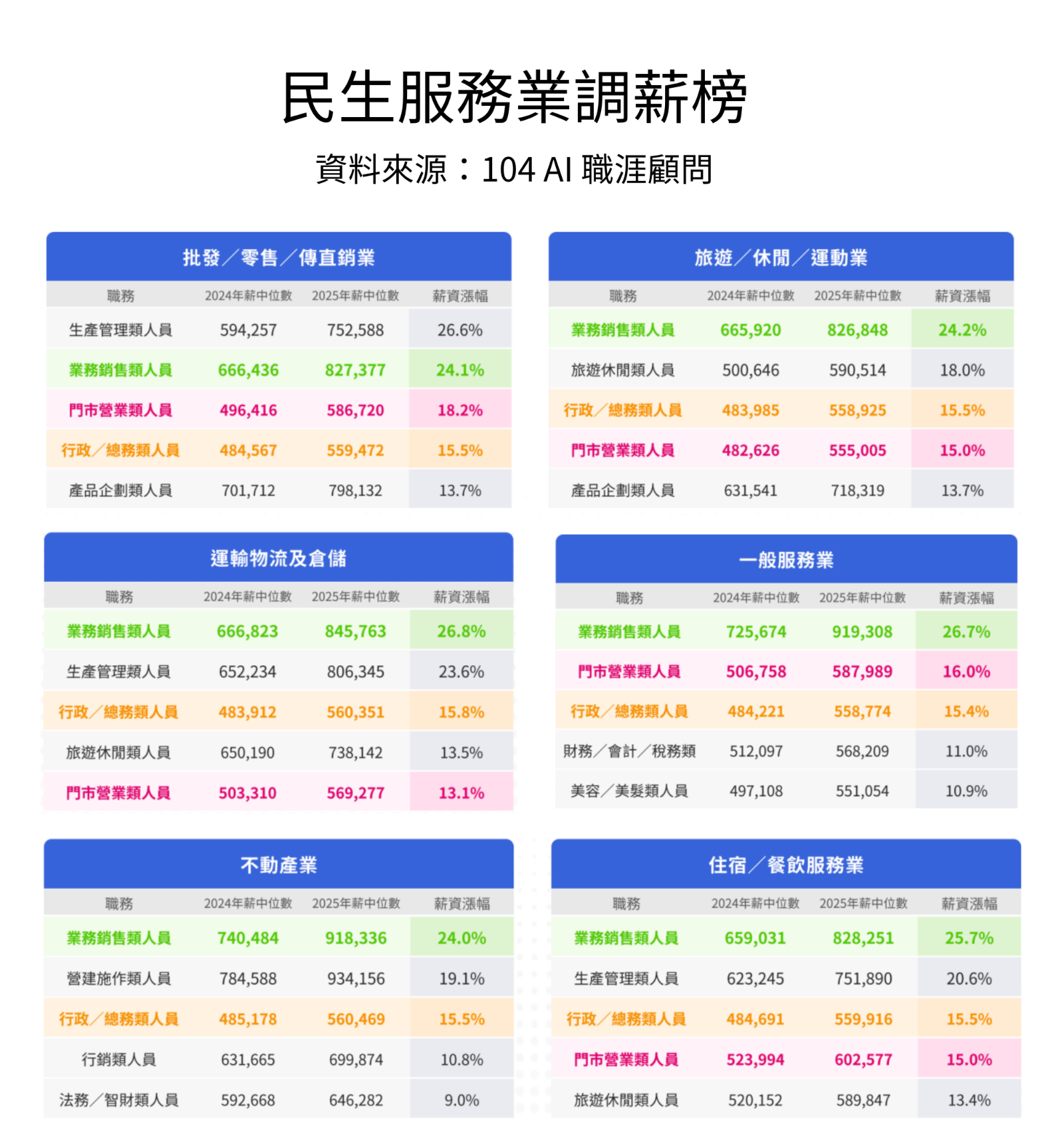 104人力銀行「AI職涯顧問」最新發布的《2025民生服務產業薪資報告書》,用數據分析住宿/餐飲服務業、一般服務業、批發/零售/傳直銷業、旅遊/休閒/運動業、運輸物流倉儲及不動產業共六大產業的薪酬與招募資訊。