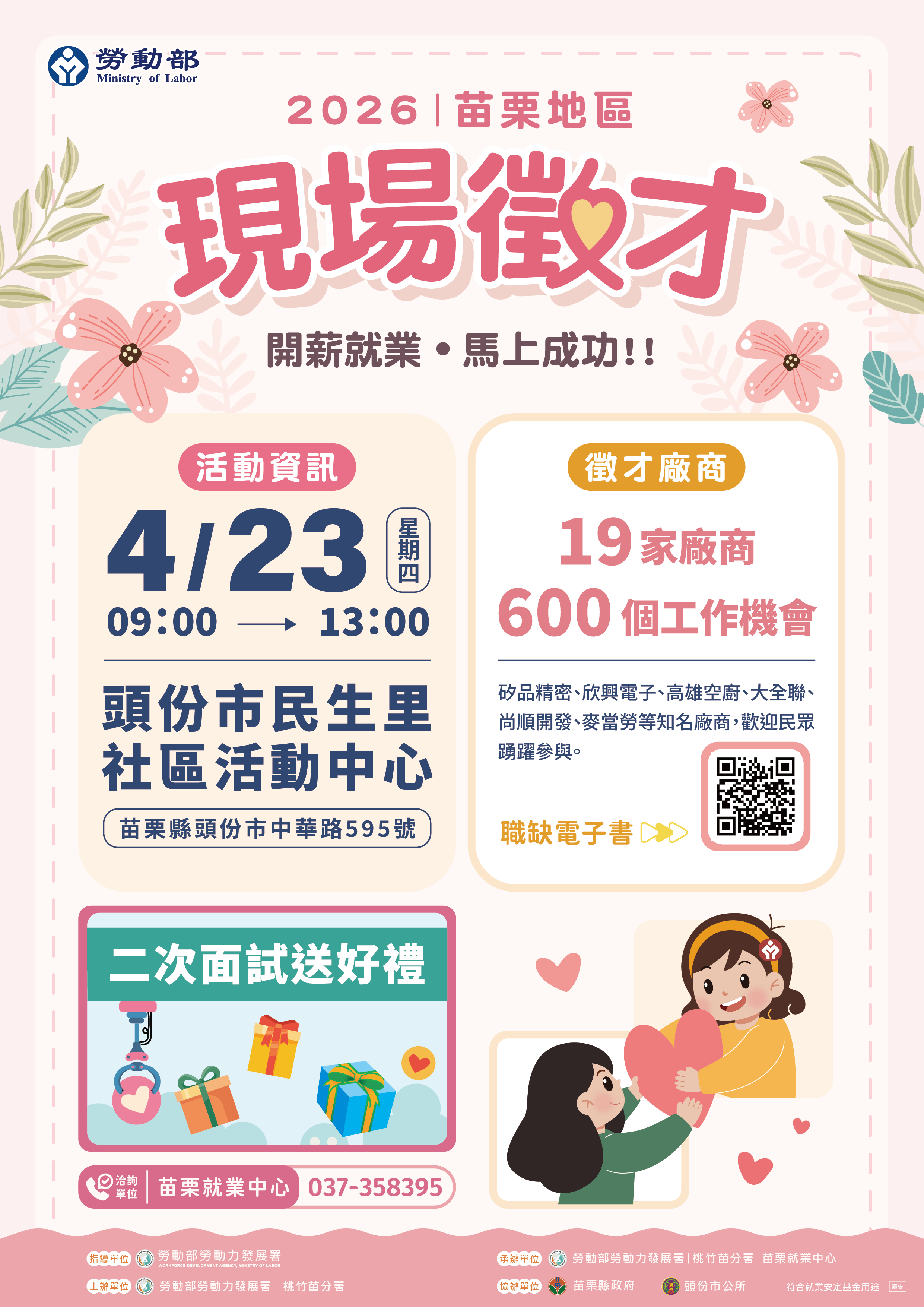 根據勞動力發展署桃竹苗分署資訊,首場徵才活動定於4月11日在苗栗縣立體育館(苗栗市中正路191號)舉行。現場匯集多家產業龍頭,展現極具競爭力的薪資條件。在地知名企業長春石化本次釋出50名化工技術員,起薪從44K起跳,並提供每胎2萬元的生育補助,以及4歲以下每月3000元的育兒津貼,展現對員工家庭生活的關照。台灣矽科宏晟則祭出最高10萬元的優渥薪資延攬研發工程師。京元電子也持續大舉招募百名工程師與技術員,除了分紅制度,更提供免費醫療與法律諮詢,甚至設有專屬按摩服務,提升員工福利品質。