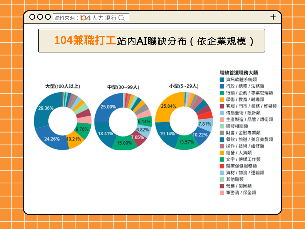104人力銀行價值營運部資深經理翁瑀婷分析,AI兼職需求的快速升溫,反映企業數位轉型已進入實作階段,產生更多彈性人才需求。中大型企業需求多集中在資訊軟體、行政總務等部門,透過導入AI工具優化內部流程,達到數位轉型目的;小型企業則以學術教育更為明顯,AI講師、教學應用與工具培訓等職缺成為主力,快速帶動企業培養AI技能。