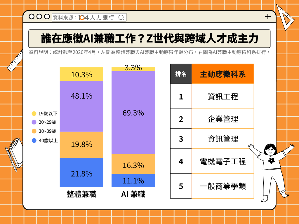 從求職者輪廓來看,AI兼職市場呈現明顯年輕化趨勢。截至2026年4月最新統計,20至29歲求職者占AI兼職應徵者總數69%,高於整體兼職市場的48%,顯示學生與新鮮人正積極透過兼職方式,提早累積AI實戰經驗。