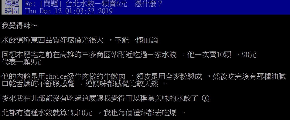許多網友同意原po的說法,在台北幾乎找不到便宜的水餃,甚至還有出現破10元的水餃,大家也把這個現象歸因為「人力成本和店租太貴」造成的。「店租 結案」、「知名的水餃都賣到一顆十元了」、「天龍餃,尊爵不凡」、「一個月店租十萬你要賣多少顆的水餃打平」、「你也在幫忙交房租不知道嗎」。