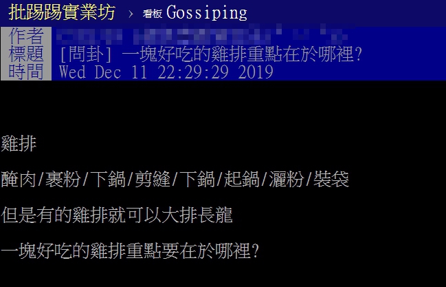 一名網友在PTT詢問「一塊好吃的雞排重點在於哪裡?」認為製作炸雞排的過程,按照順序分別是醃肉、裹粉、下鍋、剪縫、下鍋、起鍋、灑粉、裝袋,雖然每家店的程序大致相同,但有的店就是能創造出獨特風味,吸引顧客一再上門,就算大排長龍等待也甘願,其中的關鍵是什麼?