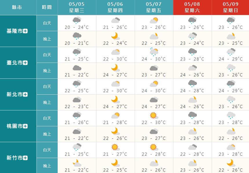 另外,周四及周五(6-7號)天氣趨於穩定,東半部地區有局部短暫雨,西半部地區為多雲到晴,午後山區有局部短暫陣雨;另外,週五北方有一道鋒面逐漸形成,臺灣附近水氣稍增,屆時大臺北地區午後可能出現局部陣雨;溫度方面,臺灣附近風向大致為東南風至偏南風,各地高溫明顯,東半部28至29度,西半部可達30度以上。