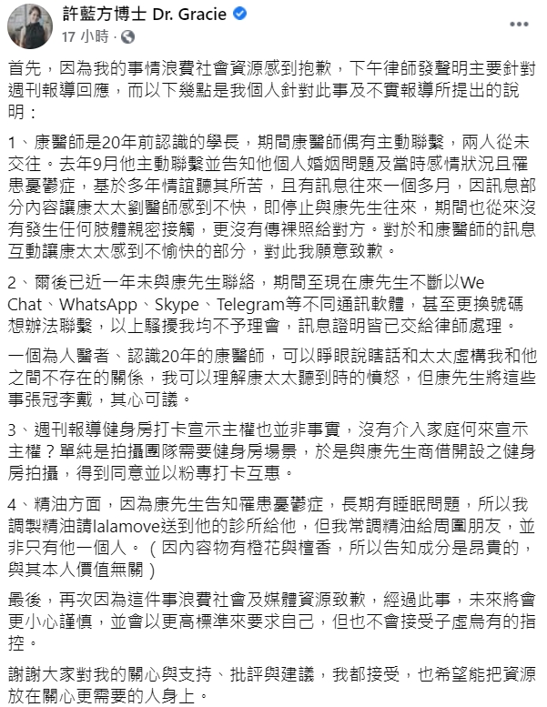 至於許小姐聲稱我因憂鬱症接受諮商及糾纏則非事實。9年前的我曾經因為憂鬱症就診,然當年在家庭的關懷之下已經完全康復,後續一切及任何不實指控將交予司法處理,感謝各界的關心,也很抱歉因為自己的私事浪費社會資源報導。