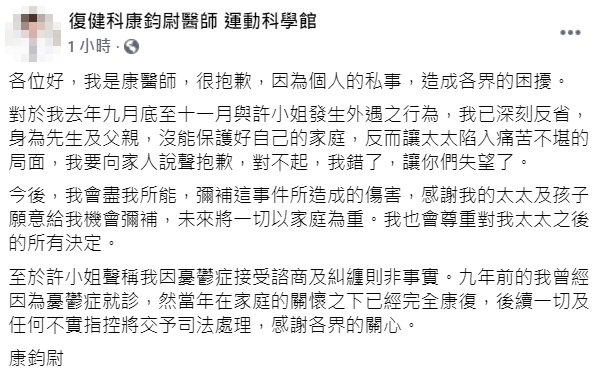 各位好,我是康醫師,很抱歉,因為個人的私事,造成各界的困擾。