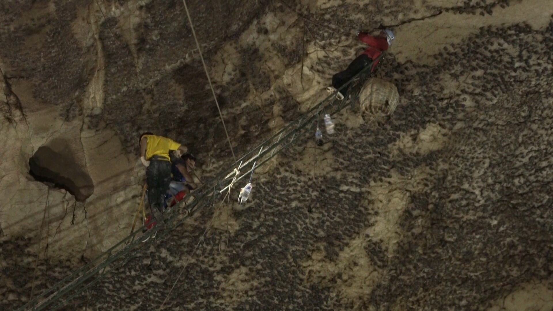 ▼工人爬上長梯採摘位於洞頂的天然洞燕窩。(圖/東森財經)