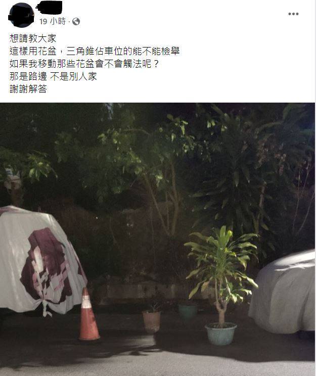 該名網友是在臉書社團「爆系知識家」發文,想知道若看到有人在未畫紅、黃線的路旁,擺放花盆、三角錐佔車位的狀況,能向有關單位舉發嗎?若是自己去移動那些物品,會不會觸法呢?同時也補充道,依自己觀察,那些都是一般的路邊,並非私人住家。