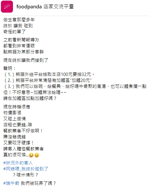 ▼一位經營牛肉麵店的網友哀怨自己遇到奇葩的訂單。(圖/翻攝自foodpanda 店家交流平臺)