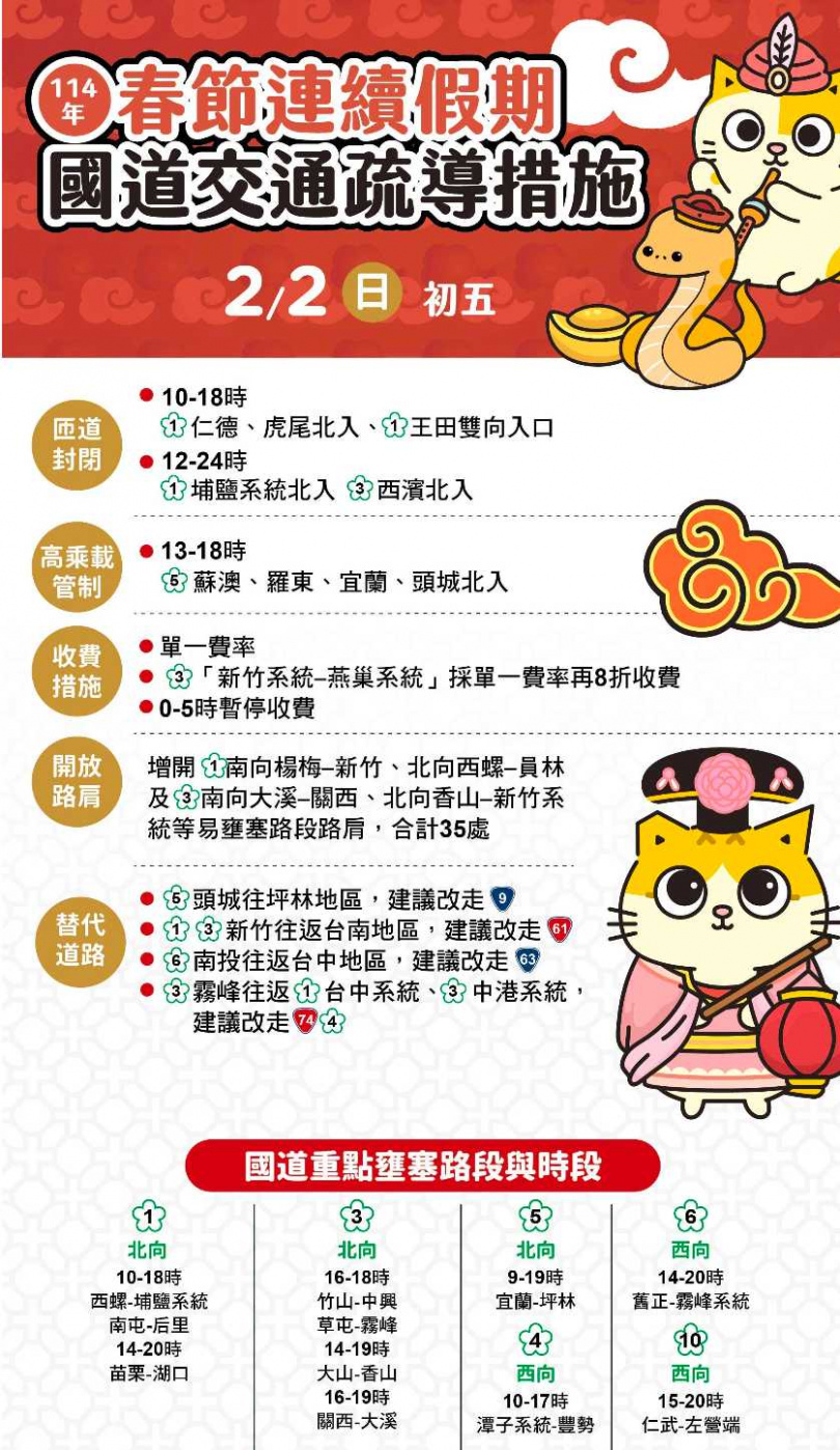 2月2日建議替代道路,國5頭城往坪林地區,建議改走台9;國1、國3新竹往返台南地區,建議改走台61;國6南投往返台中地區,建議改走台63;國3霧峰往返國1台中系統、國3中港系統,建議改走台74、國4。