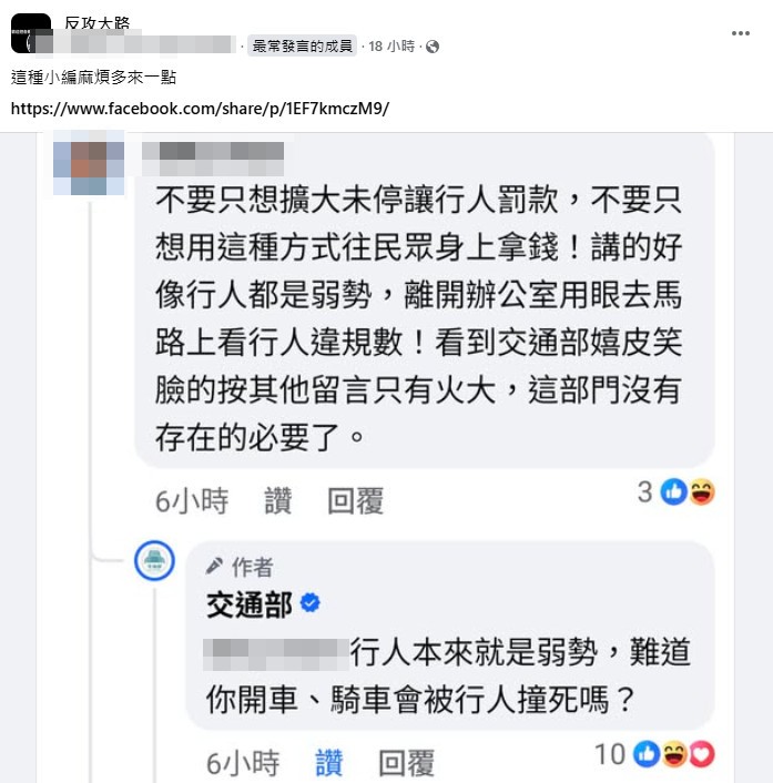 一名網友在《交通部》粉專上留言「不要只想擴大未停讓行人罰款,不要只想用這種方式往民眾身上拿錢!講的好像行人都是弱勢,離開辦公室用眼去馬路上看行人違規數!看到交通部嬉皮笑臉的按其他留言只有火大,這部門沒有存在的必要了」,粉專小編直接回嗆他「行人本來就是弱勢,難道你開車、騎車會被行人撞死嗎?」有網友將對話截圖分享到《反攻大路》社團,並寫道「這種小編麻煩多來一點」。