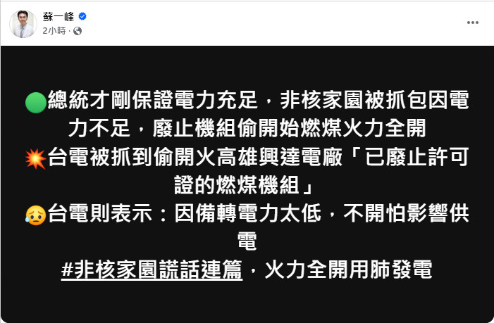 蘇一峰醫師在粉專上PO文「總統才剛保證電力充足,非核家園被抓包因電力不足,廢止機組燃煤火力全開,台電被抓到偷開火高雄興達電廠,『已廢止許可證的燃煤機組』,台電則表示:『因備轉電力太低,不開怕影響供電』」,他忍不住痛批「非核家園謊話連篇,火力全開用肺發電!」