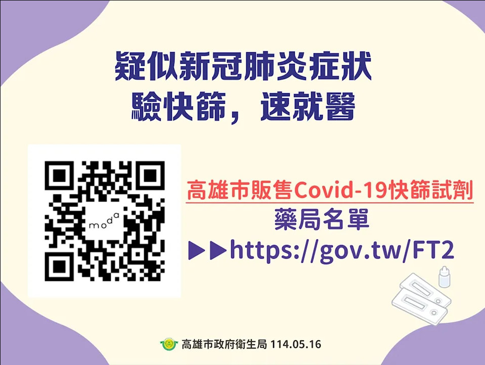 衛生局表示,日前因應疫情需求,廣發圖卡以QR CODE連結方式,每日早上10點及下午5點「2次更新」高雄市藥局庫存快篩試劑清單,便利提供市民快速查詢。相關醫療院所及藥局資訊於高雄市政府衛生局官網(https://health.kcg.gov.tw)同步更新。