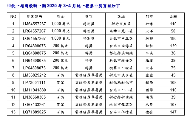 6位雲端發票專屬獎1百萬得主,分別是新北市淡水區的7-ELEVEN鑫鑫門市,花45元購買飲品;彰化縣彰化市的7-ELEVEN彰陽門市,花108元購買鮮食、購物袋;台北市中山區的7-ELEVEN國學門市,花110元買飲品、鮮食;新竹縣新埔鎮的7-ELEVEN埔嵩門市,花39元買統一晨光GOLD高纖生土司;桃園市龍潭區的7-ELEVEN禾臣門市,花107元買飲品、零食、購物袋;台南市仁德區的7-ELEVEN德發門市,花147元買統一陽光無加糖高纖豆漿、鮮食。