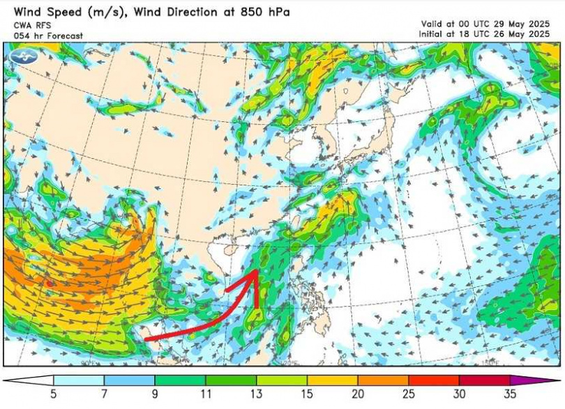前氣象局長鄭明典也透露,西南季風入南海,時間點算很明確了,也就是28~29日之間,西南季風在南海建立起來。今年台灣附近北方系統偏南,所以南海的西南季風建立後,並沒有直接持續影響台灣,斷斷續續地還是有東北風吹到台灣上空,但隨著西南季風報到,有西南季風支持的「大雨」,還是會比之前感覺很猛烈的大雨還要大。