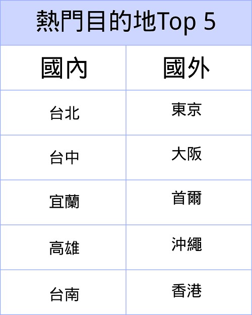 在國內熱門目的地方面,台北、台中、宜蘭、高雄與台南霸佔前五名,顯示城市觀光與在地文化依舊吸引力十足;而海外旅遊則由東京、大阪、首爾、沖繩與香港領軍,短程亞洲航線依舊是台灣旅客的首選。