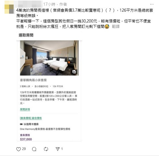 還有人說上次也出現搶購潮「訂完了結果black pink工作人員沒地方住,上次一群粉絲押寶同款飯店,black pink 沒地方住,被迫換飯店。」原PO也回文「大概粉絲在押寶偶像住哪間飯店,也跟著要住同一間,所以高級飯店房間都跑很快」。