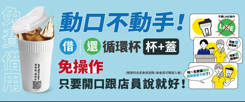 全家啟動「動口不動手」借循環杯,會員享特濃美式、特濃拿鐵、抹茶拿鐵半價。