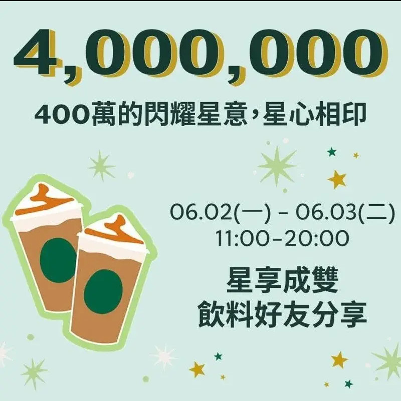 ▼星巴克慶祝星禮程會員突破400萬人次,活動期間,到門市買大杯以上,同品項就可享買1送1。(圖/翻攝《星巴克咖啡同好會(Starbucks Coffee)》粉專)