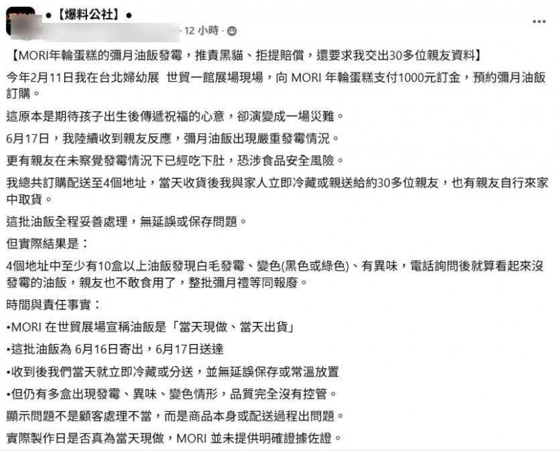 這名人妻在臉書社團「爆料公社」發文表示,她今年2月在台北婦幼展世貿一館展場現場,向「MORI年輪蛋糕」支付1000元訂金,預約彌月油飯訂購,希望能將祝福送給親友。怎料在本(6)月17日,她陸續收到親友反應,稱彌月油飯出現嚴重發霉的狀況。