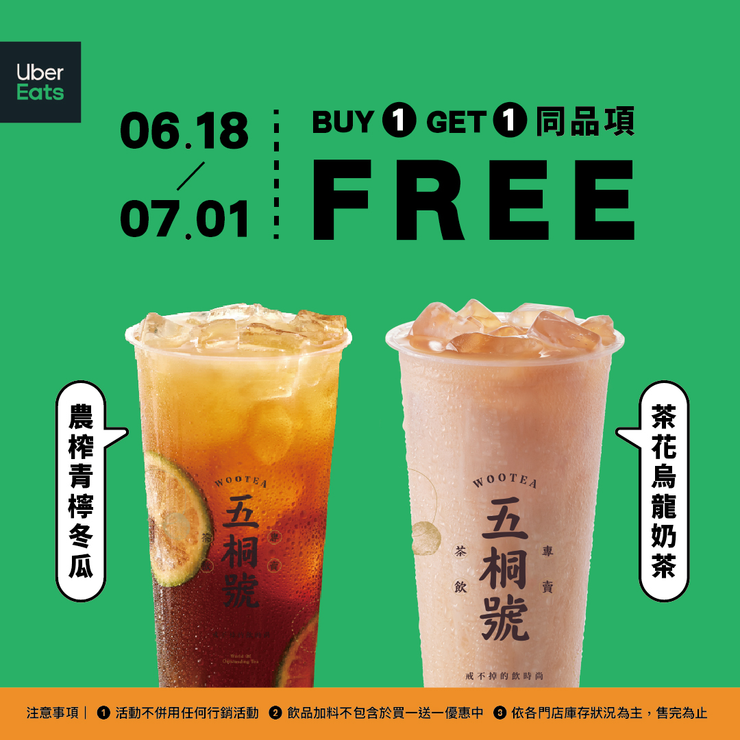 買1送1:在外送平台UberEats上可享五桐號「農榨青檸冬瓜/茶花烏龍奶茶」同品項買1送1,活動不併用任何行銷活動;飲品加料不包含於買1送1優惠中;依各門店庫存狀況為主,售完為止。