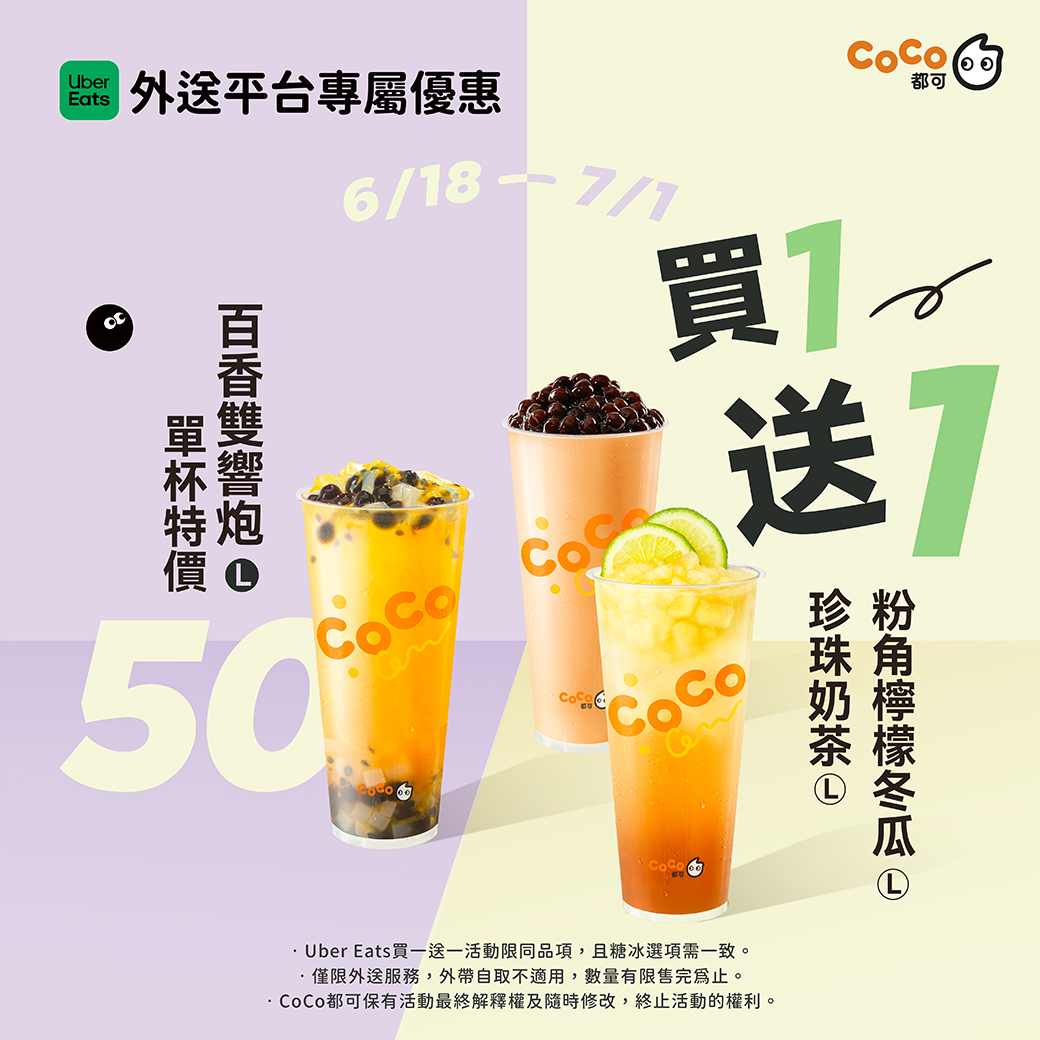 買1送1:在外送平台UberEats上可享CoCo都可珍珠奶茶(L)/粉角檸檬冬瓜(L) 同品項買1送1。限同品項同糖冰且僅限外送服務,外帶自取不適用,數量有限售完為止。活動需顯示2杯才會自動帶入折扣。