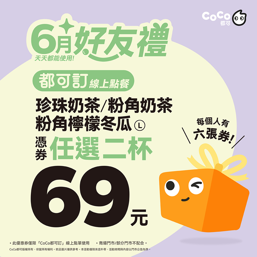 2杯69元:凡加入CoCo LINE官方帳號,6月好友禮包於都可訂線上領券,爽喝珍珠奶茶(L)/粉角奶茶(L)/粉角檸檬冬瓜(L),任選「2杯69元」;每人有6張券、1人可享12杯。