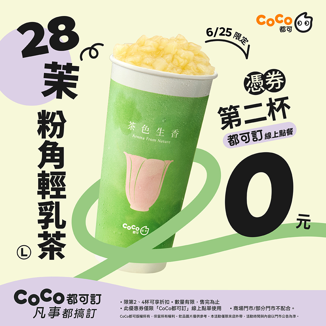 ▼CoCo都可今(25)日週三好友日,在官方LINE領券、都可訂線上點單自取,憑券可享「28茉粉角輕乳茶(L)第二杯0元」。(封面圖/翻攝《CoCo都可》粉專)