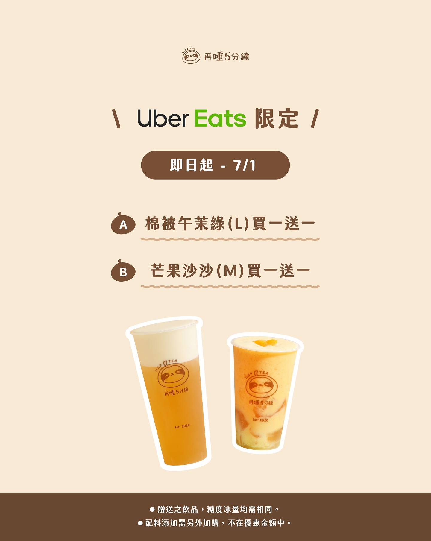 買1送1:在外送平台UberEats上可享再睡5分鐘「棉被午茉綠(L)/芒果沙沙(M)」同品項買1送1。
