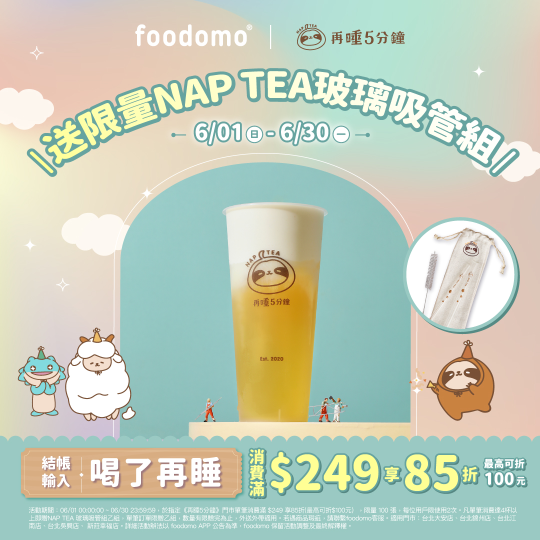 加碼好禮:在外送平台foodomo上,單筆訂單消費達4杯以上,再送「NAP TEA玻璃吸管組」乙組,每筆訂單限贈乙組,限量贈完為止。