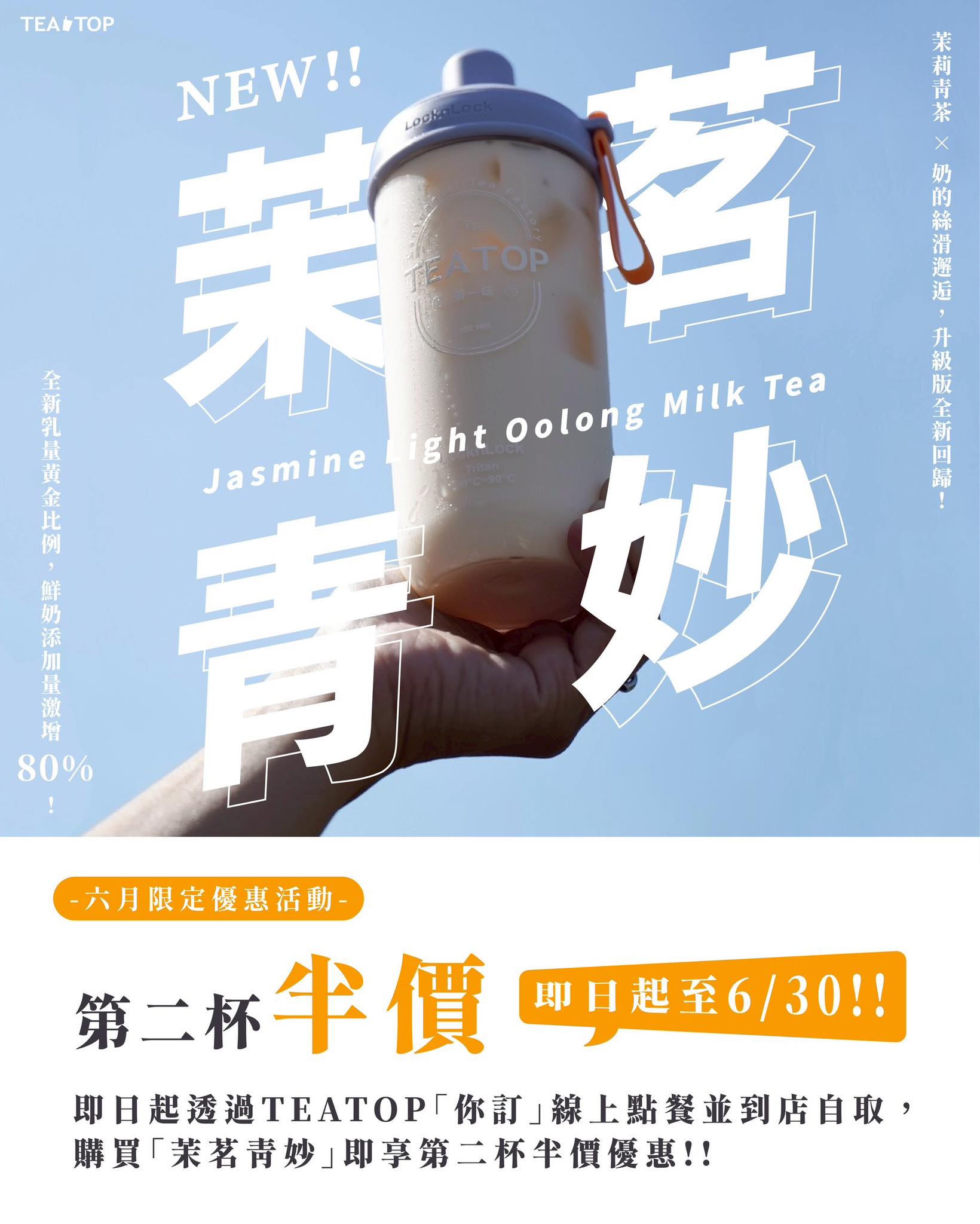 第2杯半價:透過 TEATOP「你訂」線上點餐並到店自取,可享 TEATOP「茉茗青妙」第2杯半價。