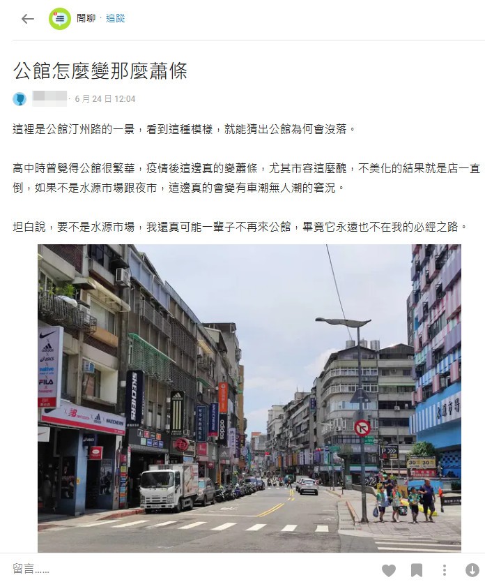 1名男網友在《Dcard》論壇PO文「公館怎麼變那麼蕭條!」他拍下公館汀州路的一景,路人只有稀稀疏疏的行人與車輛,他寫道:「看到這種模樣,就能猜出公館為何會沒落。」他表示高中時曾覺得公館很繁華,疫情後這邊真的變蕭條,尤其「1景象」難怪沒落。