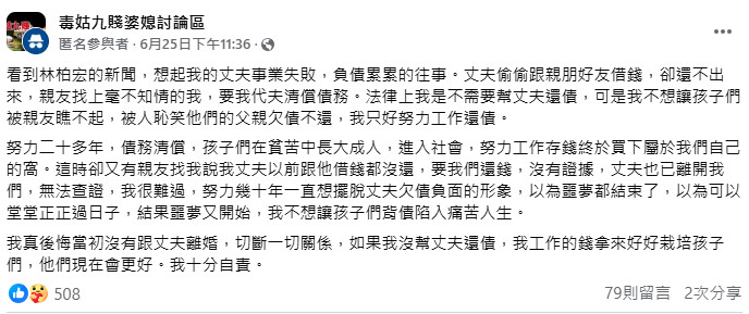 女網友在《毒姑九賤婆媳討論區》社團PO文,她表示看到林柏宏的新聞,想起她的丈夫事業失敗,負債累累的往事。她寫道「丈夫偷偷跟親朋好友借錢,卻還不出來,親友找上毫不知情的我,要我代夫清償債務。法律上我是不需要幫丈夫還債,可是我不想讓孩子們被親友瞧不起,被人恥笑他們的父親欠債不還,我只好努力工作還債。」
